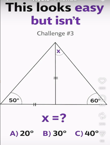 > Does $x=30$ fit? Total top angle was $70°$. $40° + 30° = 70°$.